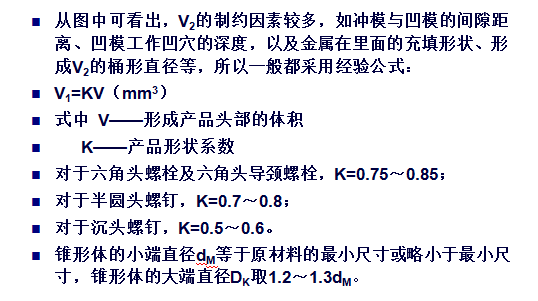 如圖可見,整個(gè)錐形頭部的體積由體積V1和V2兩部分組成,即V錐=V1+V2,而V錐等于產(chǎn)品頭部精鐓后的體積即V。V可由產(chǎn)品尺寸計(jì)算出,則V1=V-V2。